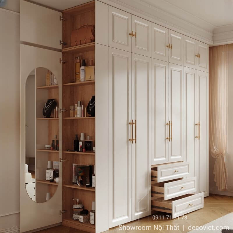 Không chỉ là tủ đựng quần áo, mẫu này còn đóng vai trò như một chiếc kệ mở nghệ thuật. Bạn có thể trưng bày túi xách, nước hoa, tranh nhỏ để biến góc tủ thành điểm nhấn trang trí ấn tượng.
