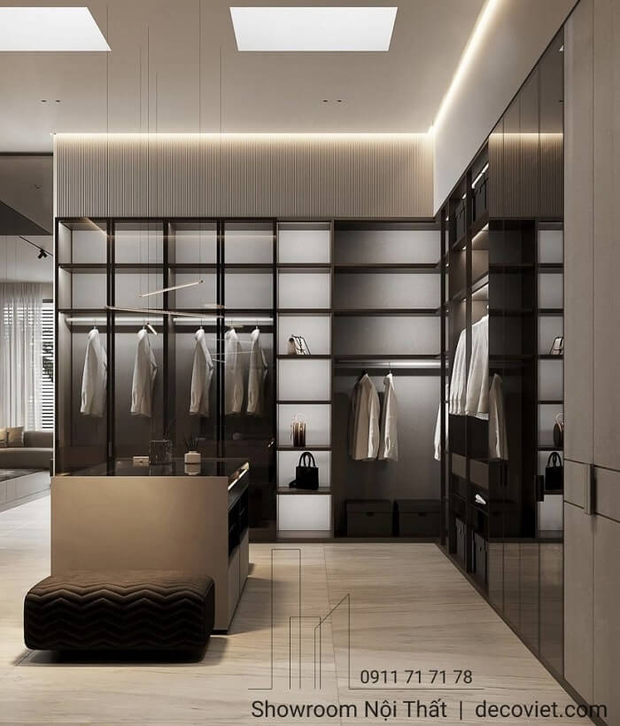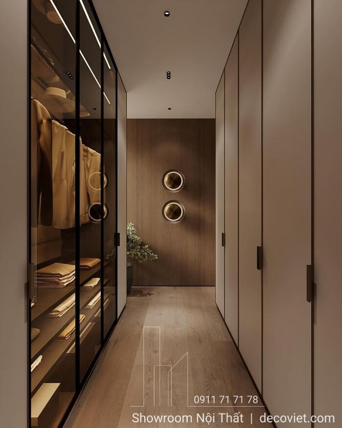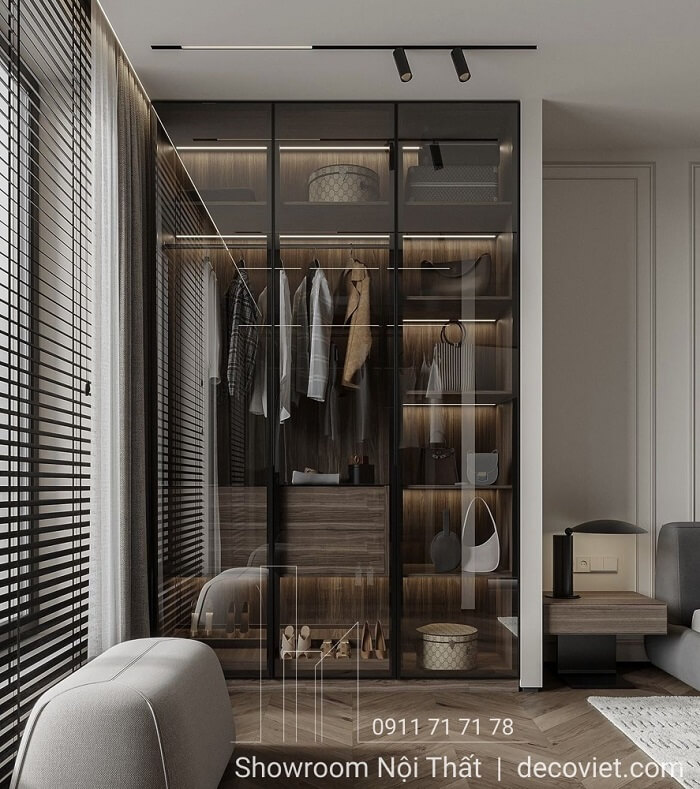 Tủ áo cánh kính là điểm nhấn sang trọng đầy cuốn hút trong phòng ngủ hiện đại. Thiết kế tủ quần áo cánh kính trong suốt kết hợp đèn LED dịu nhẹ tạo nên góc trưng bày quần áo, túi xách đẳng cấp. Kết hợp hiệu ứng đèn Led phản chiếu từ lớp kính khiến tổng thể không gian trở nên thanh lịch, hiện đại và mang đậm dấu ấn cá nhân.